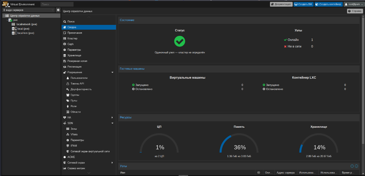 На серверах была развернута платформа виртуализации “Альт Виртуализация 11 редакция PVE”, что позволило создать единое пространство для размещения виртуальных машин сервисов цифровой кафедры.