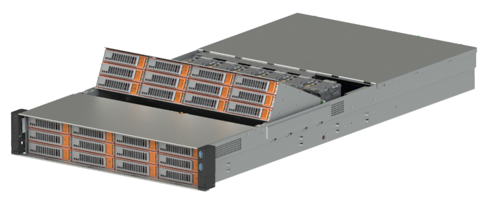 Дисковая подсистема сервера обеспечивает установку до 24 дисков SATA / SAS дисков 3’5 (LFF) и двух дисков 2.5” (SFF) SATA/NVMe PCIe